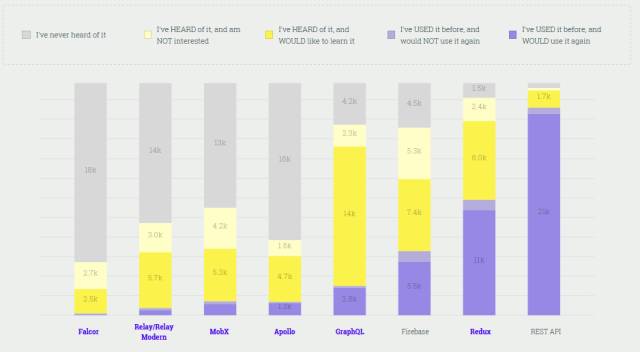 談到狀態(tài)管理工具的使用情況,REST API 毫無疑問摘得桂冠,支持者達(dá)到了 21K,接著是 Redux 和 Firebase。 GraphQL 令人印象深刻,有 14K 的受訪者表示會(huì)試一試,這意味著明年的結(jié)果可能會(huì)有所不同。