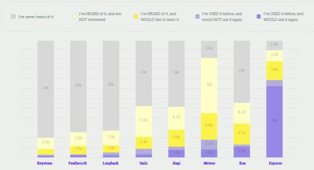 根據(jù)上面提到的 Stack Overflow 的結(jié)果,Meteor 還是挺知名的,但似乎沒有給這次的受訪者留下深刻的印象。這次排名,Meteor 排在了 Express 和 Koa 的后面,位列第三。